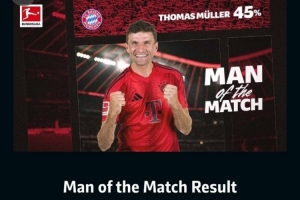 德甲官方宣布,穆勒在投票中获得45%球迷支持,战胜奥利塞(20%)和科贝尔(19%)等球员,当选本场比赛最佳球员。