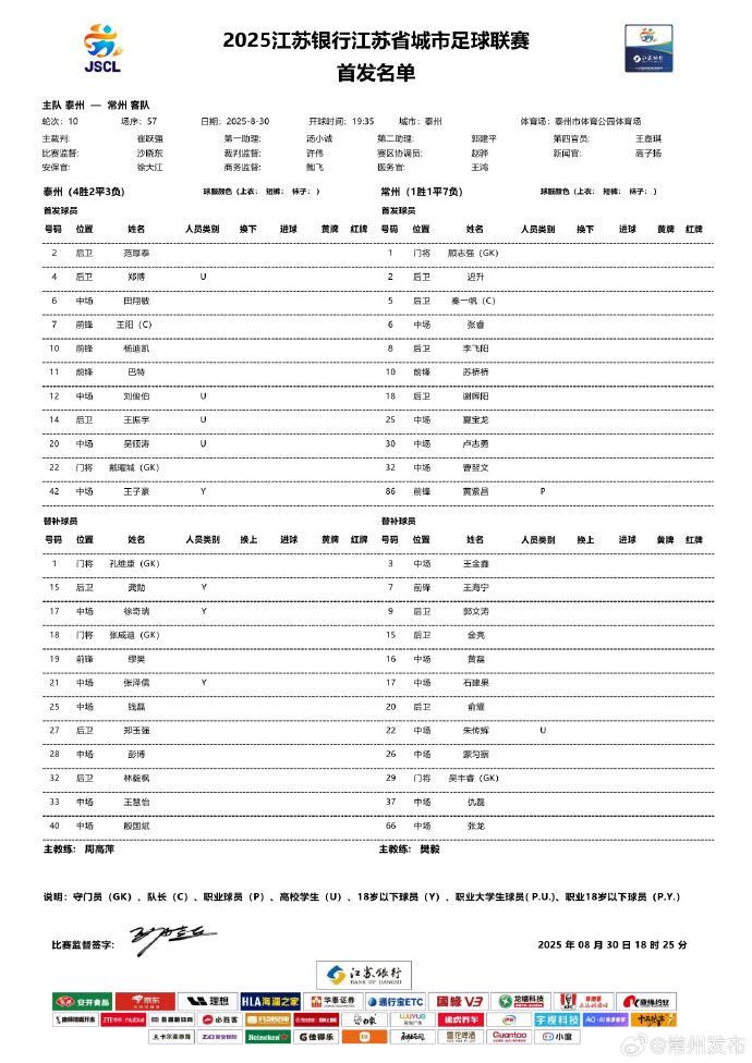 雷速体育8月30日讯 北京时间今日,“苏超”联赛第10轮,泰州队对阵常州队,赛前双方公布首发,中超河南队球员黄紫昌代表常州队出战。